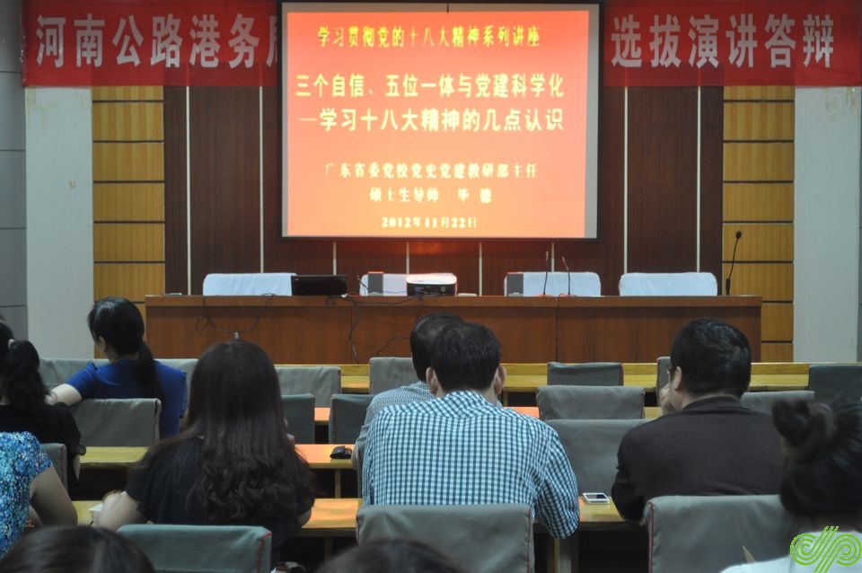 為深入學(xué)習(xí)貫徹黨的十八大精神,提高廣大黨員干部思想政治素養(yǎng),7月9日下午,公路港集團(tuán)組織開展了學(xué)習(xí)貫徹黨的十八大精神專題培訓(xùn)。集團(tuán)所屬各單位班子成員、黨群工作專兼職人員和集團(tuán)機(jī)關(guān)全體人員等60余人參加了培訓(xùn)。