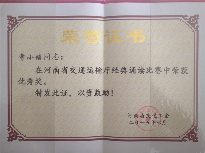 近期,在河南省交通運(yùn)輸廳舉辦的以“傳承文化,提升素質(zhì)”為主題的經(jīng)典誦讀比賽中,公路港倉儲單位職工曹小培參賽并榮獲優(yōu)秀獎。通過組織職工參與誦讀比賽,進(jìn)一步加深職工對民族精神和優(yōu)秀傳統(tǒng)文化的理解,體現(xiàn)了公路港積極培育和踐行社會主義核心價值觀的階段成果。