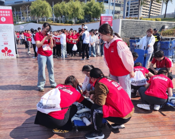 比賽中選手們從如意湖文化廣場(chǎng)出發(fā),“徒步+搭乘地鐵”穿梭河南藝術(shù)中心文化廣場(chǎng)、龍湖金融島、白廟地鐵負(fù)一層、油化廠創(chuàng)意園、鄭州商都遺址博物院、紫荊山公園廣場(chǎng)等地標(biāo)建筑,完成心肺復(fù)蘇+AED操作、氣道異物梗阻處置、外傷包扎、掃碼答題、小腿骨折固定及擔(dān)架搬運(yùn)、AED一體機(jī)合影6項(xiàng)應(yīng)急救護(hù)挑戰(zhàn)。120名裁判和380名志愿者堅(jiān)守在賽道全程,以嚴(yán)謹(jǐn)態(tài)度保障賽事公平,用貼心服務(wù)護(hù)航選手安全。