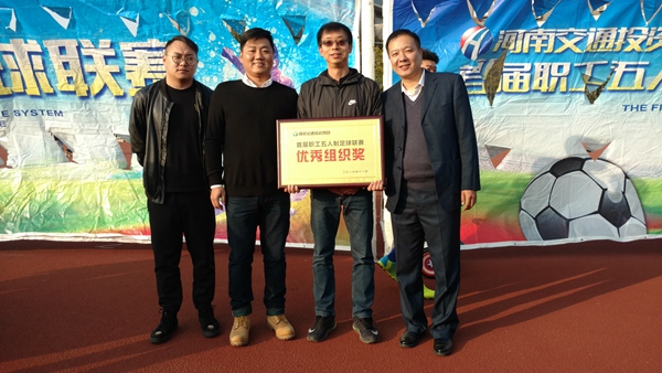 11月5日下午,歷時(shí)三個(gè)月的交通投資集團(tuán)首屆職工五人制足球聯(lián)賽落下帷幕,足球聯(lián)賽頒獎(jiǎng)儀式在河南財(cái)經(jīng)政法大學(xué)隆重舉行,公路港集團(tuán)參賽球隊(duì)榮獲優(yōu)秀組織獎(jiǎng)。在此次足球聯(lián)賽中,公路港代表隊(duì)克服人員不足、年齡偏大等種種困難,利用節(jié)假日休息時(shí)間,積極組織訓(xùn)練,在聯(lián)賽過(guò)程中充分展示了公路港人良好的精神面貌和團(tuán)隊(duì)合作精神。 |