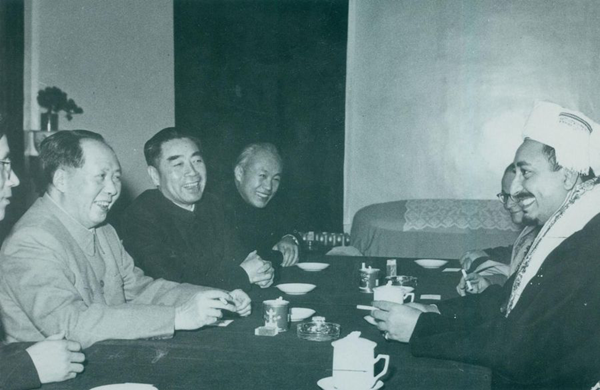 1958年1月3日,周恩來陪同毛澤東在杭州會見也門王國副首相兼外交大臣和國防大臣巴德爾王太子(右一)及其隨行人員。