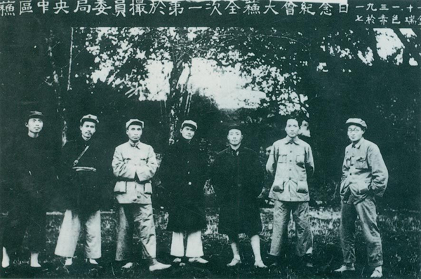 1931年1月15日,中共蘇區(qū)中央局在中央蘇區(qū)的寧都縣黃陂成立,周恩來任書記。周恩來未到職前,由項(xiàng)英代理,同年10月以后,由毛澤東代理。圖為蘇區(qū)中央局委員合。